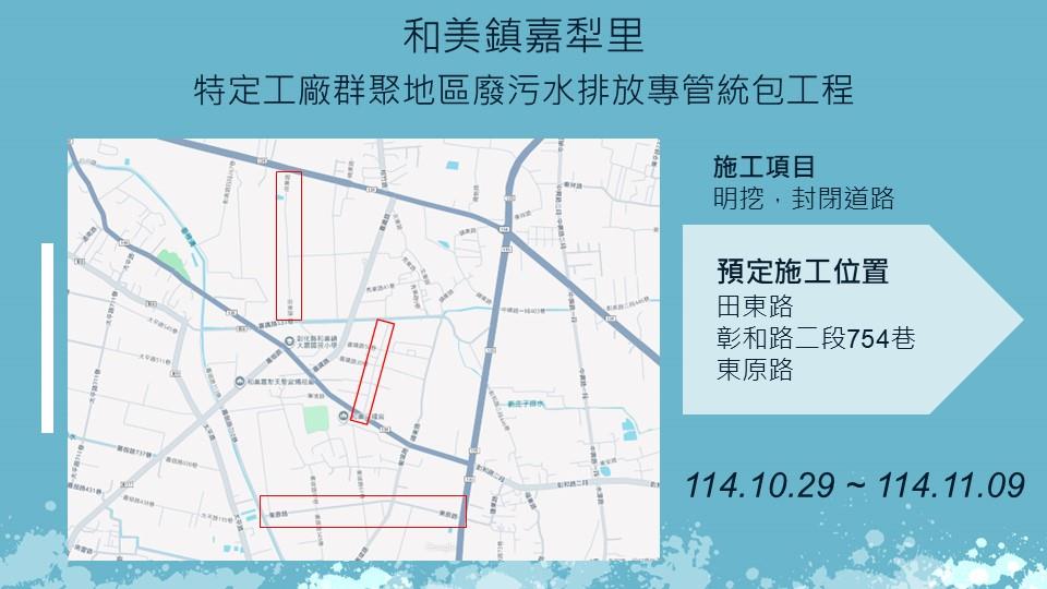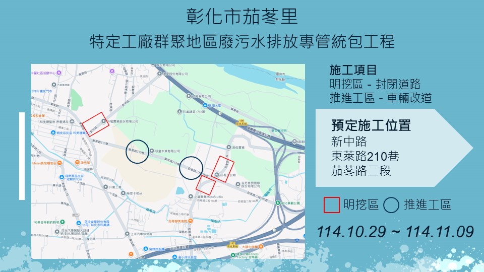 公告資訊 【彰化市茄苳里、和美鎮嘉犁里特定工廠廢污水排放專管工程施工公告】 發布日期 2025/10/30~2025/11/09 | 發佈單位: 水利資源處 | 發佈日期: 倪先生 7532678 | 更新日期 2025/10/30 | 瀏覽人數: 9人 《置頂》 【彰化市茄苳里、和美鎮嘉犁里特定工廠廢污水排放專管工程施工公告】 彰化縣政府水利資源處於彰化市茄苳里及和美鎮嘉犁里進行特定工廠污水排放專管建設工程, 10月29日至11月09日預定施工範圍及管線施工路段,如圖示,工程採分段分區方式施工,相關期程將視現場施工情形調整,部分路段實施車道分流及縮減,敬請多加小心! 1、 彰化縣彰化市茄苳里特定工廠群聚地區廢污水排放專管統包工程,將於新中路、茄苳路二段進行明挖作業;於東萊路210巷進行推進作業。 2、 彰化縣和美鎮嘉犁里特定工廠群聚地區廢污水排放專管統包工程,將於田東路、彰和路二段754巷、東原路進行明挖作業。