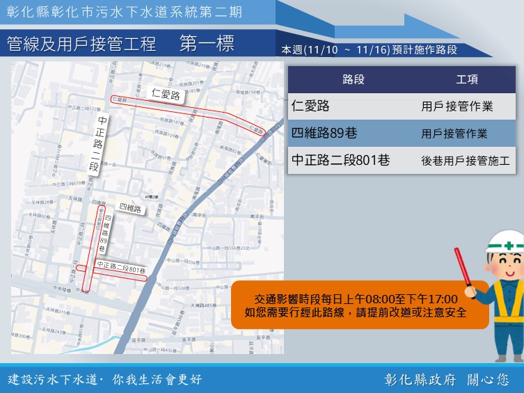 公告資訊 【彰化市污水下水道施工公告11/10(一)~11/16(日)】 發布日期 2025/11/13~2025/11/16 | 發佈單位: 水利資源處下水道科 | 發佈日期: 吳先生 7532672 | 更新日期 2025/11/13 | 瀏覽人數: 12人 《置頂》 【彰化市污水下水道施工公告11/10(一)~11/16(日)】 內政部國土管理署下水道工程分署於彰化市區正進行彰化市污水下水道系統管網工程,於三民路、中正路、中山路等重要市區道路進行施工,本週各區施工工項及路段如下,相關期程將視施工情形調整,部分路段實施車道分流及縮減,用路人可多加留意施工路段,注意用路安全,造成不便之處,敬請見諒! 1、 彰化市污水下水道系統第二期管線及用戶接管工程第一標 ,於仁愛路、四維路89巷,進行用戶接管作業;於中正路二段801巷,進行後巷用戶接管施工作業。 2、 彰化市污水下水道系統第二期管線及用戶接管工程第二標,於永安街平交道附近、三民路362號附近、三民路與中民街口、中山路二段838號附近,進行推進作業。 3、 彰化市污水下水道系統第二期管線及用戶接管工程第三標,於華山路(近中正路二段),進行推進作業。