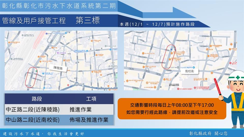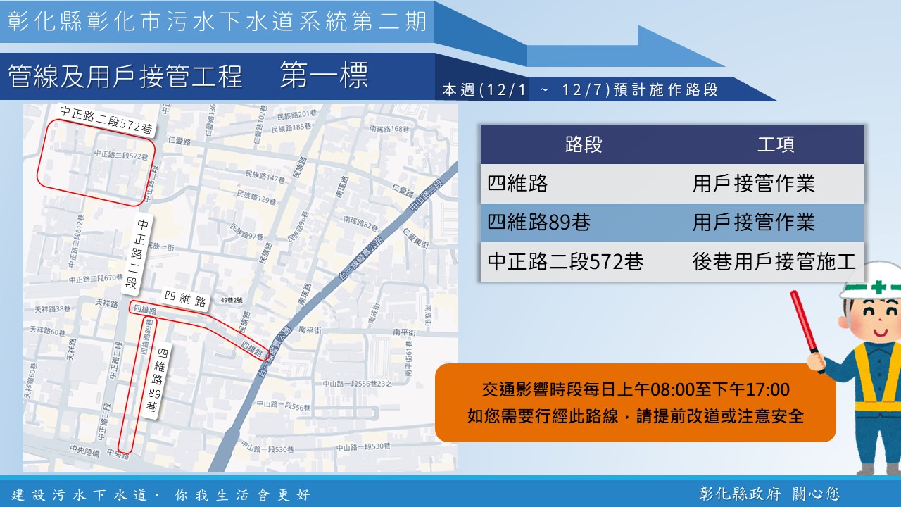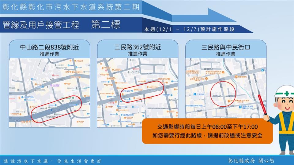 公告資訊 【彰化市污水下水道施工公告12/1(一)~12/7(日)】 發布日期 2025/12/03~2026/12/07 | 發佈單位: 水利資源處下水道科 | 發佈日期: 李先生 7532673 | 更新日期 2025/12/03 | 瀏覽人數: 9人 《置頂》 內政部國土管理署下水道工程分署於彰化市區正進行彰化市污水下水道系統管網工程,於三民路、中正路、中山路等重要市區道路進行施工,本週各區施工工項及路段如下,相關期程將視施工情形調整,部分路段實施車道分流及縮減,用路人可多加留意施工路段,注意用路安全,造成不便之處,敬請見諒! 1、 彰化市污水下水道系統第二期管線及用戶接管工程第一標 ,於四維路、四維路89巷,進行用戶接管作業;於中正路二段572巷,進行後巷用戶接管施工作業。 2、 彰化市污水下水道系統第二期管線及用戶接管工程第二標,於中山路二段838號附近、三民路362號附近、三民路與中民街口,進行推進作業。 3、 彰化市污水下水道系統第二期管線及用戶接管工程第三標,於中正路二段(近陳稜路),進行推進作業;於中山路二段(近南校街) ,進行佈場及推進作業。