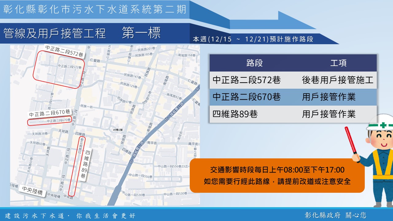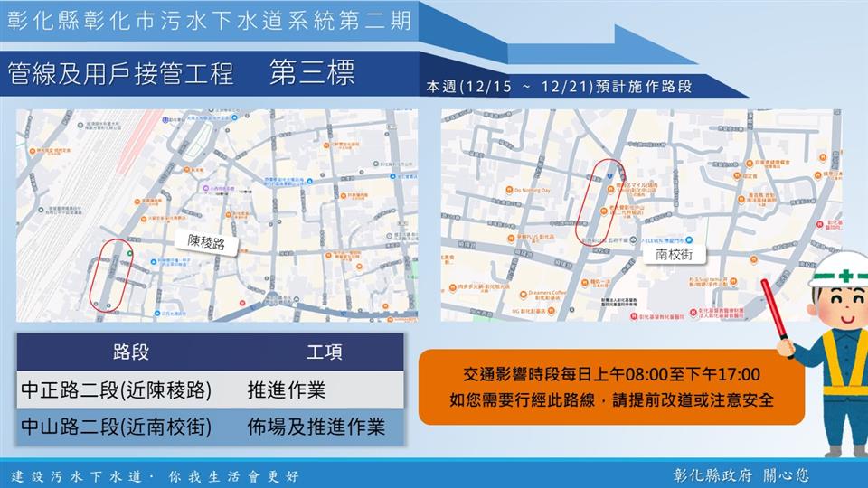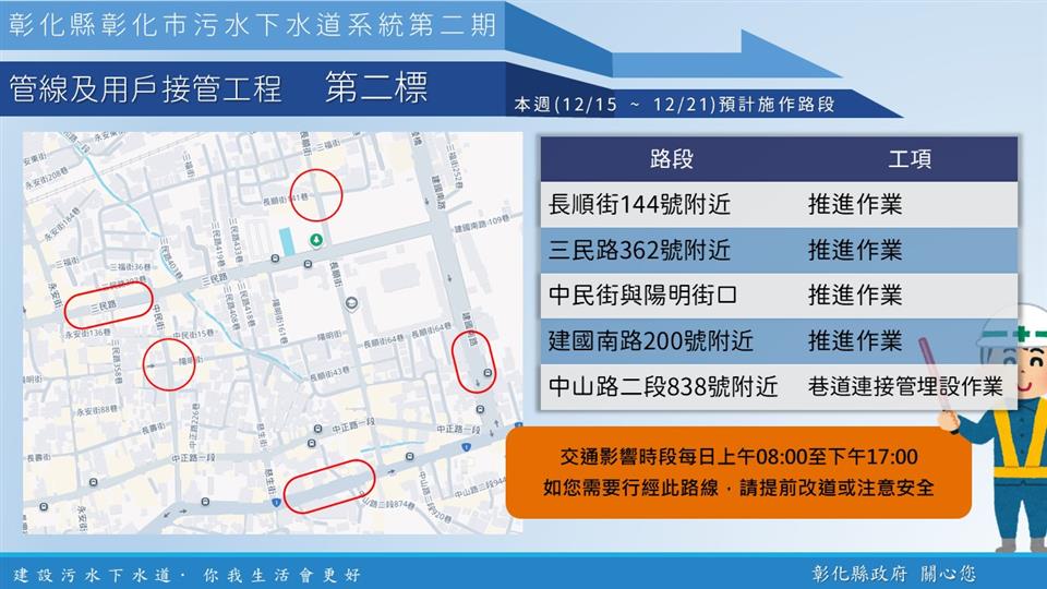 公告資訊 【彰化市污水下水道施工公告12/15(一)~12/21(日)】 歷史訊息 | 發布日期 2025/12/15~2025/12/21 | 發佈單位: 水利資源處下水道科 | 發佈日期: 李先生 7532673 | 更新日期 2025/12/15 | 瀏覽人數: 18人 《置頂》 內政部國土管理署下水道工程分署於彰化市區正進行彰化市污水下水道系統管網工程,於三民路、中正路、中山路等重要市區道路進行施工,本週各區施工工項及路段如下,相關期程將視施工情形調整,部分路段實施車道分流及縮減,用路人可多加留意施工路段,注意用路安全,造成不便之處,敬請見諒! 1、 彰化市污水下水道系統第二期管線及用戶接管工程第一標 ,於中正路二段572巷,進行後巷用戶接管施工作業;於四維路89巷、中正路二段670巷,進行用戶接管作業。 2、 彰化市污水下水道系統第二期管線及用戶接管工程第二標,於長順街144號附近、三民路362號附近、中民街與陽明街口、建國南路200號附近,進行推進作業;於中山路二段838號附近,進行巷道連接管埋設作業。 3、 彰化市污水下水道系統第二期管線及用戶接管工程第三標,於中正路二段(近陳稜路),進行推進作業;於中山路二段(近南校街) ,進行佈場及推進作業。