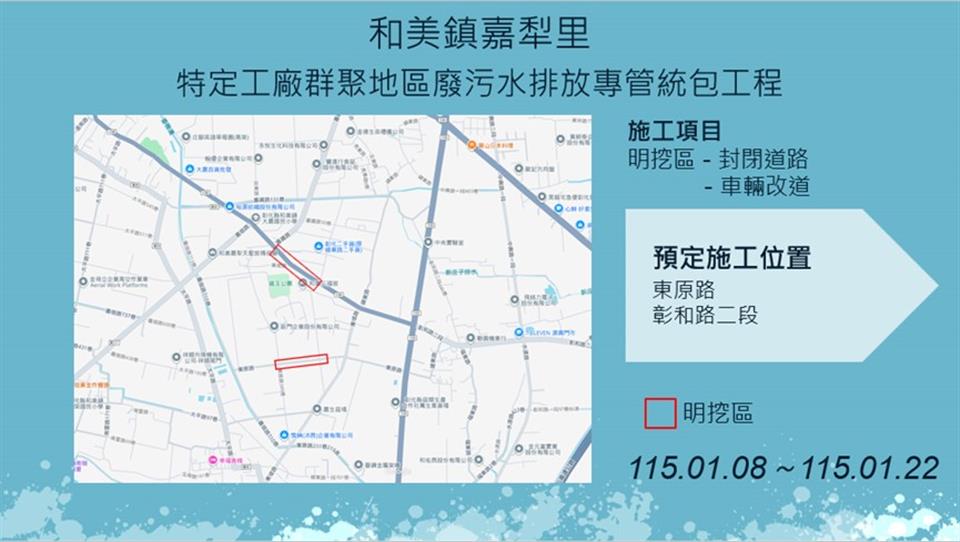 公告資訊 【彰化市茄苳里、和美鎮嘉犁里特定工廠廢污水排放專管工程施工公告】 發布日期 2026/01/12~2026/01/22 | 發佈單位: 水利資源處下水道科 | 發佈日期: 倪先生 7532678 | 更新日期 2026/01/12 | 瀏覽人數: 21人 《置頂》 彰化縣政府水利資源處於彰化市茄苳里及和美鎮嘉犁里進行特定工廠污水排放專管建設工程,於115年1月8日至115年1月22日預定施工範圍及管線施工路段,如圖示,工程採分段分區方式施工,相關期程將視現場施工情形調整,部分路段實施車道分流及縮減,敬請多加小心! 1、 彰化縣彰化市茄苳里特定工廠群聚地區廢污水排放專管統包工程,將於於茄苳路二段、茄苳路二段565巷(國三交流道下方)、寶廓路(國三交流道下方)進行推進作業。 2、 彰化縣和美鎮嘉犁里特定工廠群聚地區廢污水排放專管統包工程,將於東原路、彰和路二段進行明挖作業。