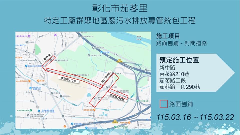 公告資訊 【彰化市茄苳里特定工廠廢污水排放專管工程施工公告】 歷史訊息 | 發布日期 2026/03/16~2026/03/22 | 發佈單位: 水利資源處下水道科 | 發佈日期: 倪先生 7532678 | 更新日期 2026/03/13 | 瀏覽人數: 16人 《置頂》 彰化縣政府水利資源處於彰化市茄苳里進行特定工廠污水排放專管建設工程,於115年3月16日至115年3月22日預定進行路面刨鋪作業,如圖示,路面刨鋪採分段分區方式施工,相關期程將視現場施工情形調整,部分路段實施車道分流及縮減,敬請多加小心! 1、 彰化縣彰化市茄苳里特定工廠群聚地區廢污水排放專管統包工程,將於於新中路、東萊路210巷、茄苳路二段、茄苳路二段290巷進行路面刨鋪作業。