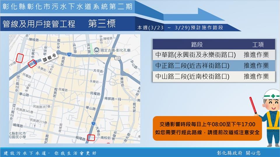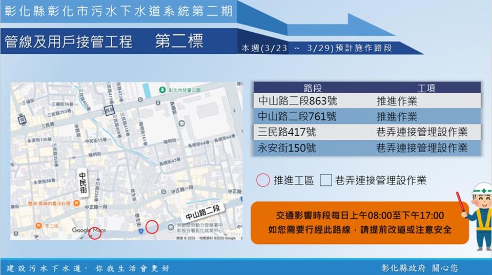 公告資訊 【彰化市污水下水道施工公告3/23(一)~3/29(日)】 發布日期 2026/03/23~2026/03/29 | 發佈單位: 水利資源處下水道科 | 發佈日期: 李先生 7532673 | 更新日期 2026/03/23 | 瀏覽人數: 2人 《置頂》 內政部國土管理署下水道工程分署於彰化市區正進行彰化市污水下水道系統管網工程,於中山路二段、三民路、永安街等重要市區道路進行施工,本週各區施工工項及路段如下,相關期程將視施工情形調整,部分路段實施車道分流及縮減,用路人可多加留意施工路段,注意用路安全,造成不便之處,敬請見諒! 1、 彰化市污水下水道系統第二期管線及用戶接管工程第二標,於中山路二段863號、中山路二段761號,進行推進作業;於三民路417號、永安街150號,進行巷弄連接管埋設作業。 2、 彰化市污水下水道系統第二期管線及用戶接管工程第三標,於中華路(永興街與永樂街路口)、中正路二段(近吉祥街路口) 、中山路二段(近南校街路口),進行推進作業。