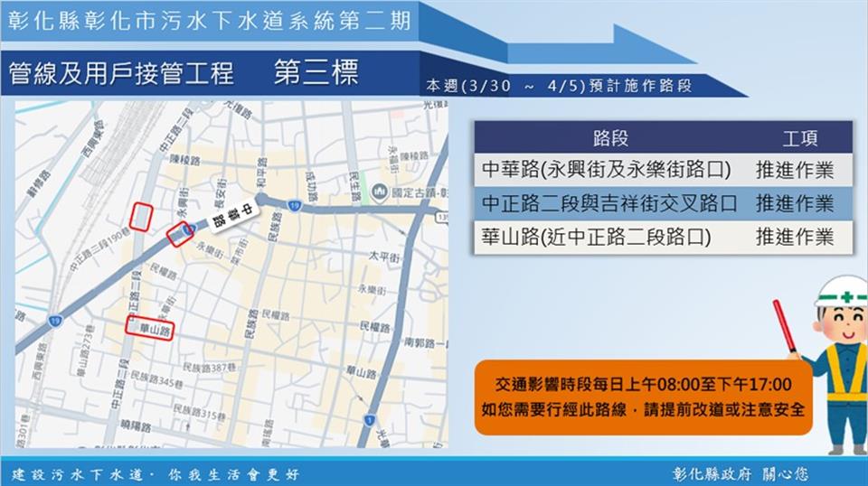 公告資訊 【彰化市污水下水道施工公告3/30(一)~4/5(日)】 發布日期 2026/03/30~2026/04/05 | 發佈單位: 水利資源處下水道科 | 發佈日期: 李先生 7532673 | 更新日期 2026/03/30 | 瀏覽人數: 11人 《置頂》 內政部國土管理署下水道工程分署於彰化市區正進行彰化市污水下水道系統管網工程,於中山路二段、中正路二段、華山路重要市區道路進行施工,本週各區施工工項及路段如下,相關期程將視施工情形調整,部分路段實施車道分流及縮減,用路人可多加留意施工路段,注意用路安全,造成不便之處,敬請見諒! 1、 彰化市污水下水道系統第二期管線及用戶接管工程第二標,於、中山路二段761號、中民街與中正路口、中民街與三民路口,進行推進作業;於三福街109號,進行巷弄連接管埋設作業。 2、 彰化市污水下水道系統第二期管線及用戶接管工程第三標,於中華路(永興街與永樂街路口)、中正路二段與吉祥街交叉路口、華山路(近中正路二段路口),進行推進作業。
