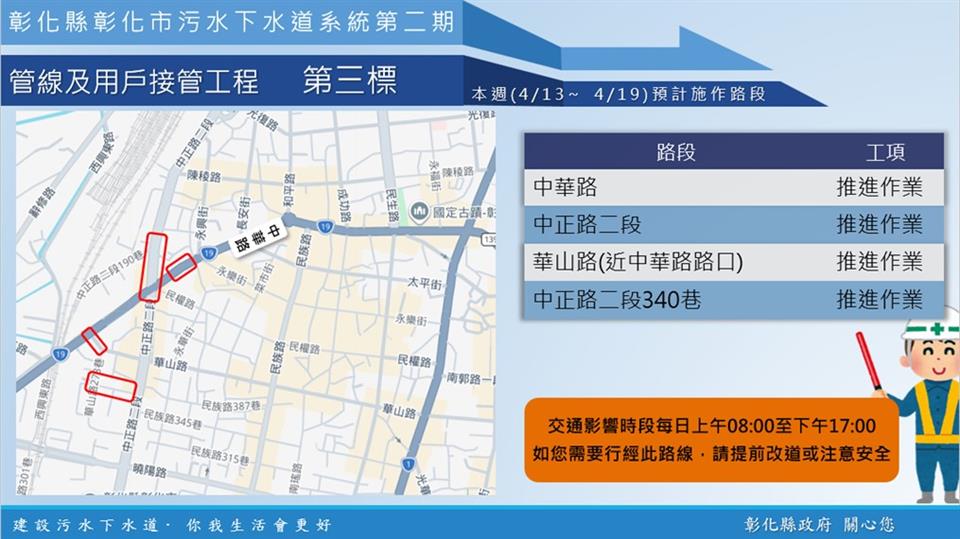 公告資訊 【彰化市污水下水道施工公告4/13(一)~4/19(日)】 發布日期 2026/04/13~2026/04/19 | 發佈單位: 水利資源處下水道科 | 發佈日期: 李先生 7532673 | 更新日期 2026/04/13 | 瀏覽人數: 24人 《置頂》 內政部國土管理署下水道工程分署於彰化市區正進行彰化市污水下水道系統管網工程,於中山路二段、中正路二段、中華路重要市區道路進行施工,本週各區施工工項及路段如下,相關期程將視施工情形調整,部分路段實施車道分流及縮減,用路人可多加留意施工路段,注意用路安全,造成不便之處,敬請見諒! 1、 彰化市污水下水道系統第二期管線及用戶接管工程第二標,於中山路二段761號、中民街與中正路口、中山路二段807號,進行推進作業;於三福街123號、中正路一段36號、陽明街126號,進行巷弄連接管埋設作業。 2、 彰化市污水下水道系統第二期管線及用戶接管工程第三標,於中華路、中正路二段、華山路(近中正路二段路口)、中正路二段340巷,進行推進作業。