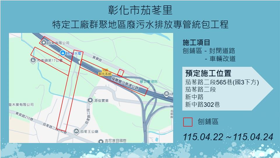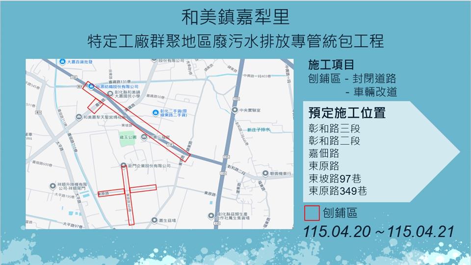 公告資訊 【彰化市茄苳里、和美鎮嘉犁里特定工廠廢污水排放專管工程施工公告】 發布日期 2026/04/17~2026/04/25 | 發佈單位: 水利資源處下水道科 | 發佈日期: 倪先生 7532678 | 更新日期 2026/04/17 | 瀏覽人數: 21人 《置頂》 彰化縣政府水利資源處於和美鎮嘉犁里115年 4月20日至115年4月21日及彰化市茄苳里115年 4月22日至115年4月25日進行特定工廠污水排放專管建設工程,預定道路刨鋪作業,如圖示,工程採分段分區方式施工,相關期程將視現場施工情形調整,部分路段實施車道封閉,敬請多加小心! 1、 彰化縣和美鎮嘉犁里特定工廠群聚地區廢污水排放專管統包工程,將於於茄苳路二段565巷(國三交流道下方)、茄苳路二段、新中路、新中路302巷進行道路刨鋪作業。 2、 彰化縣彰化市茄苳里特定工廠群聚地區廢污水排放專管統包工程,將於彰和路三段、彰和路二段、嘉佃路、東原路、東坡路97巷、東原路349巷進行道路刨鋪作業。