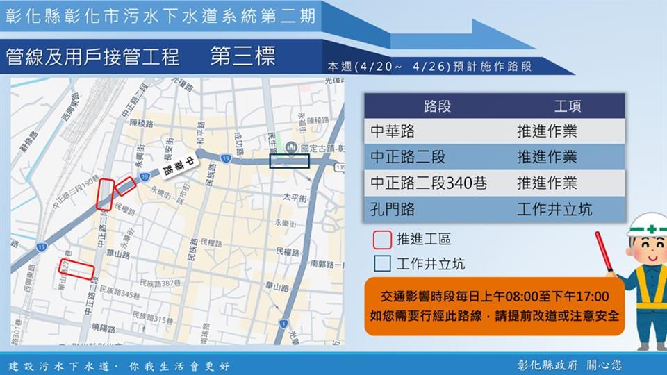 公告資訊 【彰化市污水下水道施工公告4/20(一)~4/26(日)】 發布日期 2026/04/20~2026/04/26 | 發佈單位: 水利資源處下水道科 | 發佈日期: 李先生 7532673 | 更新日期 2026/04/20 | 瀏覽人數: 9人 《置頂》 內政部國土管理署下水道工程分署於彰化市區正進行彰化市污水下水道系統管網工程,於中山路二段、中正路一段、中華路重要市區道路進行施工,本週各區施工工項及路段如下,相關期程將視施工情形調整,部分路段實施車道分流及縮減,用路人可多加留意施工路段,注意用路安全,造成不便之處,敬請見諒! 1、 彰化市污水下水道系統第二期管線及用戶接管工程第二標,於中民街與中正路口、中山路二段807號,進行推進作業;於三福街1號、中正路一段105號、三民路399-5號,進行巷弄連接管埋設作業。 2、 彰化市污水下水道系統第二期管線及用戶接管工程第三標,於中華路、中正路二段、中正路二段340巷,進行推進作業;於孔門路,進行工作井立坑。