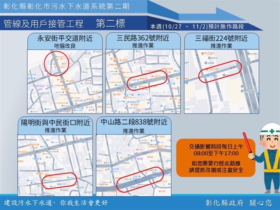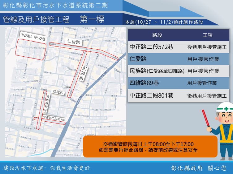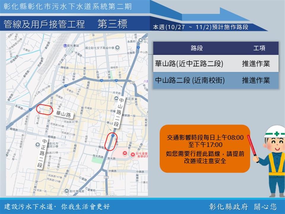 公告資訊 【彰化市污水下水道施工公告10/27(一)~11/2(日)】 歷史訊息 | 發布日期 2025/10/27~2025/11/02 | 發佈單位: 水利資源處下水道科 | 發佈日期: 吳先生 7532672 | 更新日期 2025/10/27 | 瀏覽人數: 3人 【彰化市污水下水道施工公告10/27(一)~11/2(日)】 內政部國土管理署下水道工程分署於彰化市區正進行彰化市污水下水道系統管網工程,於三民路、中正路、中山路等重要市區道路進行施工,本週各區施工工項及路段如下,相關期程將視施工情形調整,部分路段實施車道分流及縮減,用路人可多加留意施工路段,注意用路安全,造成不便之處,敬請見諒! 1、 彰化市污水下水道系統第二期管線及用戶接管工程第一標 ,於仁愛路、民族路(仁愛路至四維路)、四維路89巷,進行用戶接管作業;於中正路二段572巷、中正路二段801巷,進行後巷用戶接管施工作業。 2、 彰化市污水下水道系統第二期管線及用戶接管工程第二標,於永安街平交道附近進行地盤改良作業,於三民路362號附近、三福街224號附近、陽明街與中民街口附近、中山路二段838號附近,進行推進作業。 3、 彰化市污水下水道系統第二期管線及用戶接管工程第三標,於華山路(近中正路二段)、中山路二段 (近南校街),進行推進作業。