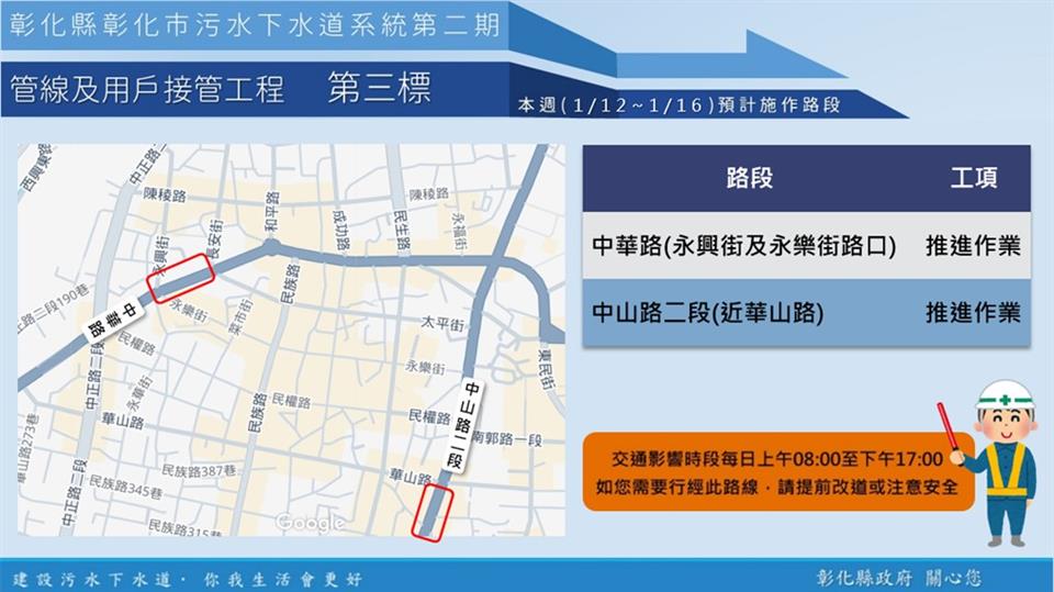 公告資訊 【彰化市污水下水道施工公告1/12(一)~1/16(五)】 歷史訊息 | 發布日期 2026/01/12~2026/01/16 | 發佈單位: 水利資源處下水道科 | 發佈日期: 李先生 7532673 | 更新日期 2026/01/12 | 瀏覽人數: 17人 內政部國土管理署下水道工程分署於彰化市區正進行彰化市污水下水道系統管網工程,於中山路、三民路、永安街、等重要市區道路進行施工,本週各區施工工項及路段如下,相關期程將視施工情形調整,部分路段實施車道分流及縮減,用路人可多加留意施工路段,注意用路安全,造成不便之處,敬請見諒! 1、 彰化市污水下水道系統第二期管線及用戶接管工程第二標,於永安街平交道附近、三民路362號附近、中民街與陽明街口、長順街144號附近、中山路二段838號附近,進行推進作業;於三福街、長順街64巷、中正路一段32巷,進行巷弄連接管埋設作業。 2、 彰化市污水下水道系統第二期管線及用戶接管工程第三標,於中華路(永興街與永樂街路口)、中山路二段(近華山路),進行推進作業。